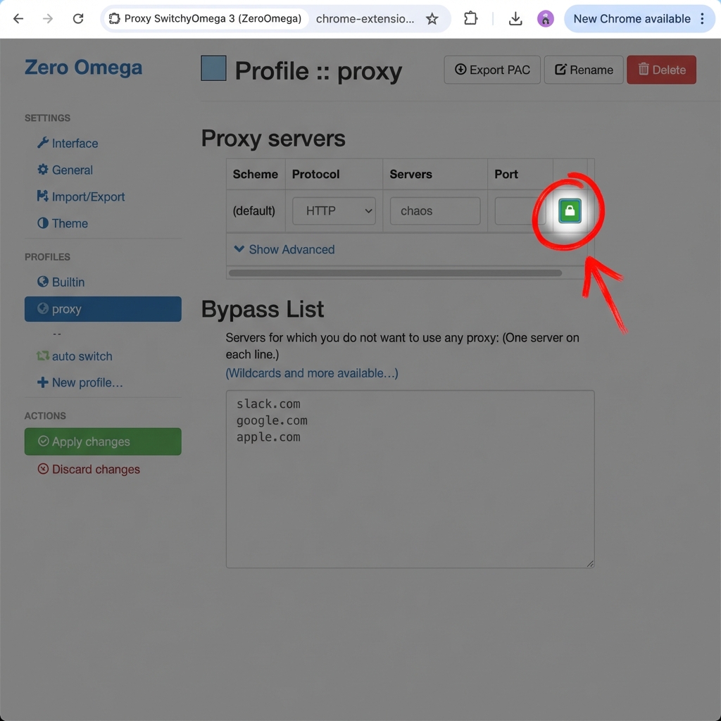 This is the most common issue with SwitchyOmega. The extension does not sync credentials from the popup automatically. You must manually configure the "Lock Icon". Here is how to fix it in 30 seconds.