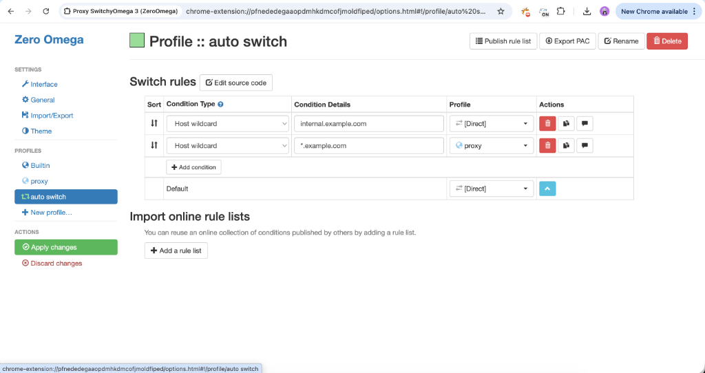The best feature of SwitchyOmega is the Auto Switch mode. Instead of sending ALL your browser traffic through the proxy (which breaks Spotify and slows down Google), you can set rules.